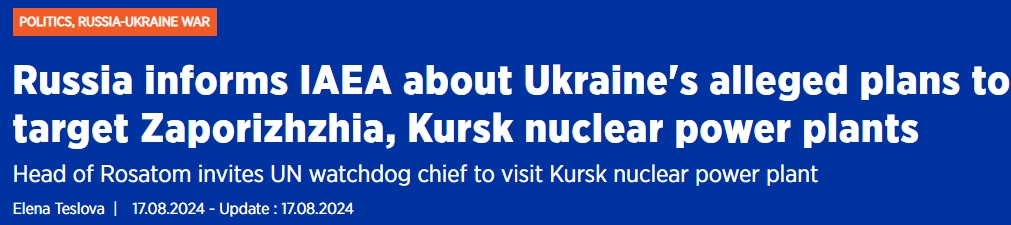 当天早些时候,俄罗斯国防部宣称基辅方面希望袭击库尔斯克地区的乏核燃料储存设施,指责俄罗斯“自我炮击”,随后基辅方面还将对扎波罗热核电站采取同样的行动,称这是莫斯科的“报复性打击”。