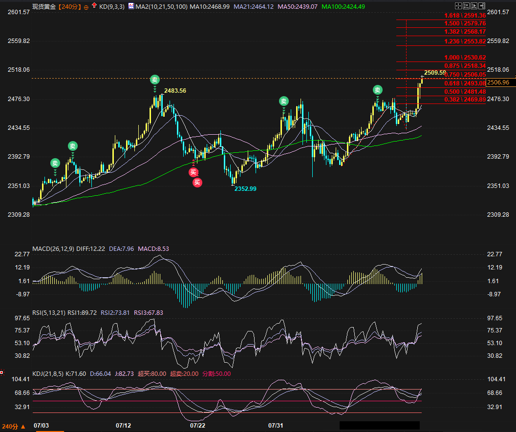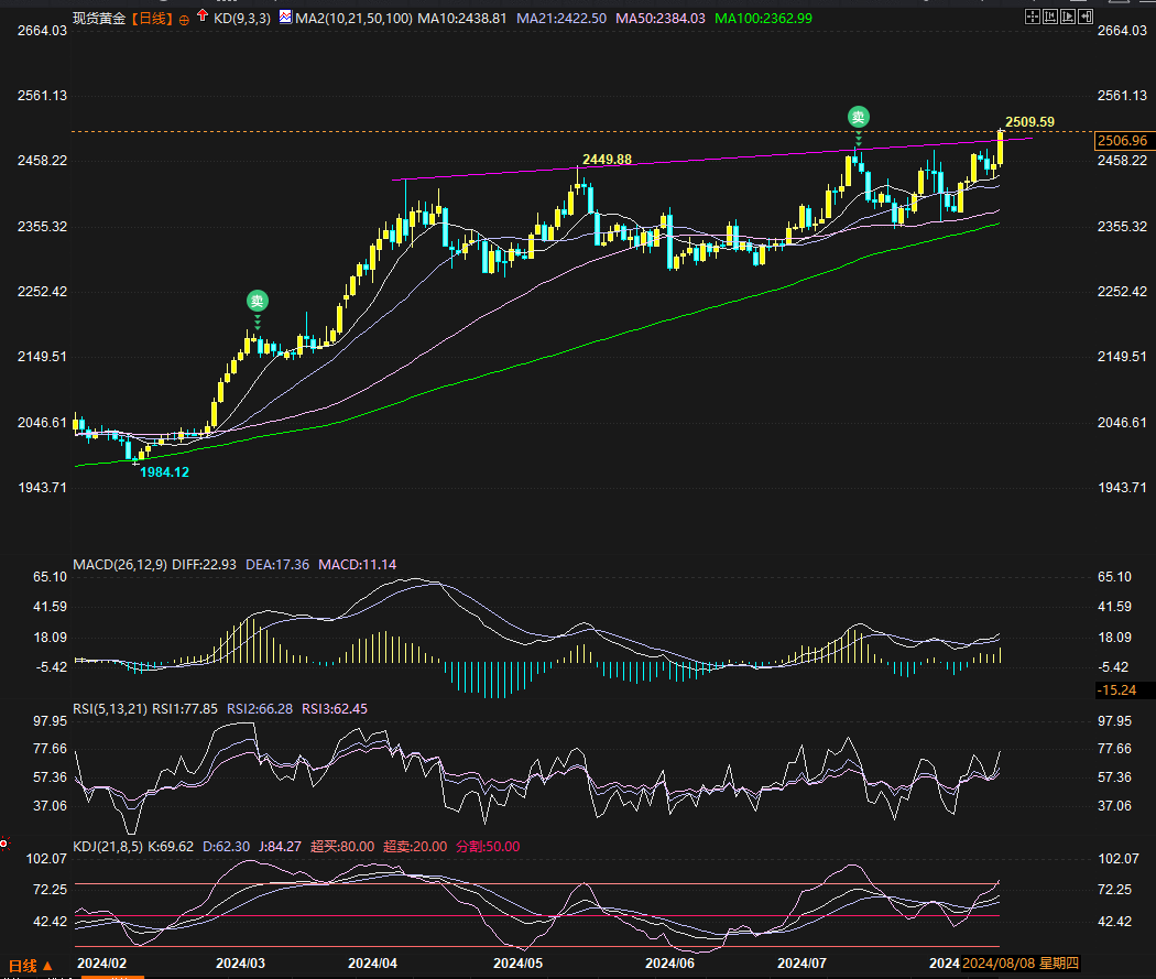 汇通财经APP讯——上周(0812-0816当周),金价收涨3.13%至2506.96美元/盎司,创四个半月(4月初以来)最大周度涨幅。其五天中的一头一尾两根大阳线加中间的小整理行情,最终把行情推高了逾80美元,金价突破原历史新高2483.56并创历史新高至2509.59美元/盎司。