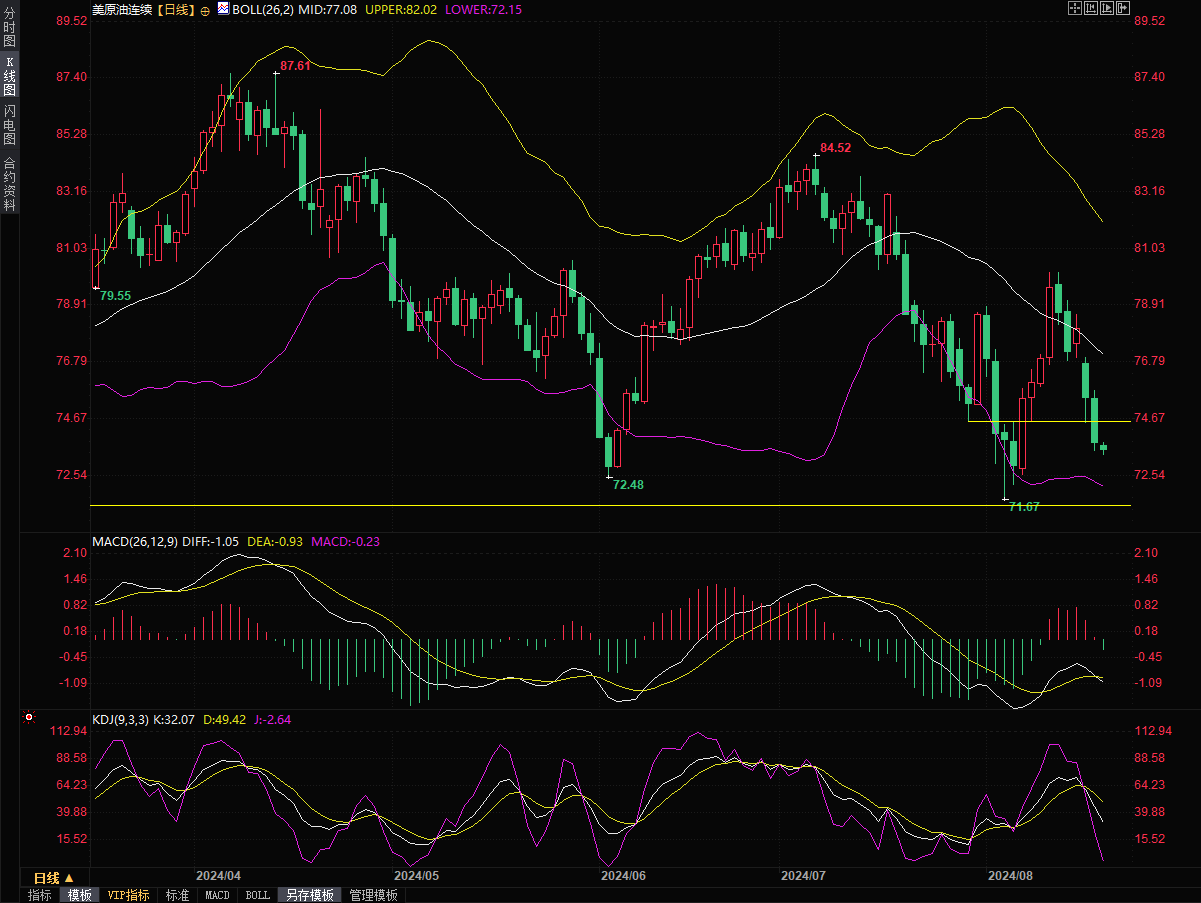 美原油目前交投于73.60美元/桶,油价周一每桶下跌超过2美元,至近两周低位附近,因中东和谈成功的前景降低了供应风险,而主要石油进口国的经济疲软可能抑制需求。