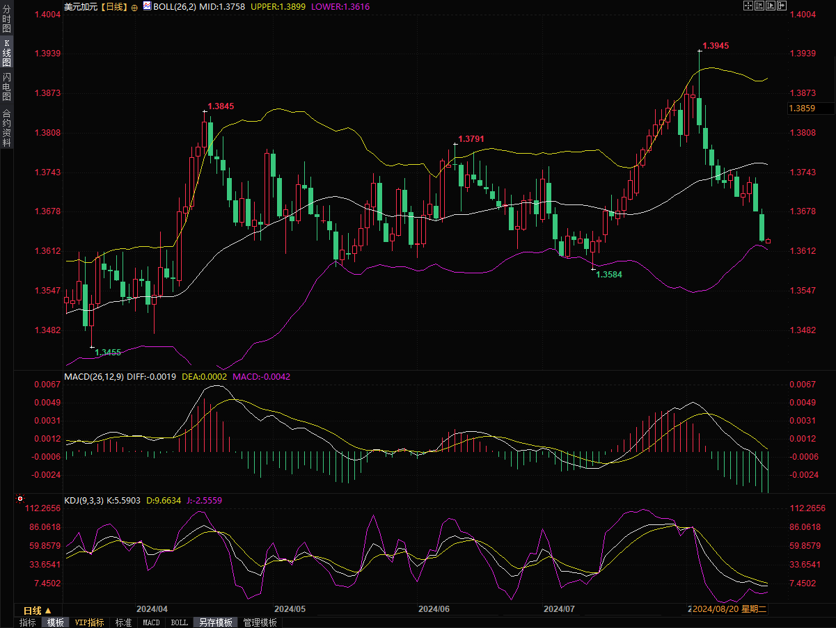美元/加元回吐了前两个交易日的近期涨幅,并跌至一个多月低点。截至周一收盘,跌幅0.35%,收报1.3632,为7月12日以来最低收盘价。这一下行空间归因于美联储官员对其政策立场发表鸽派评论后不温不火的美元,这增加了美联储在9月份降息的可能性,同时,加拿大央行进一步降息的可能性加大,从而削弱了美元/加元货币对。