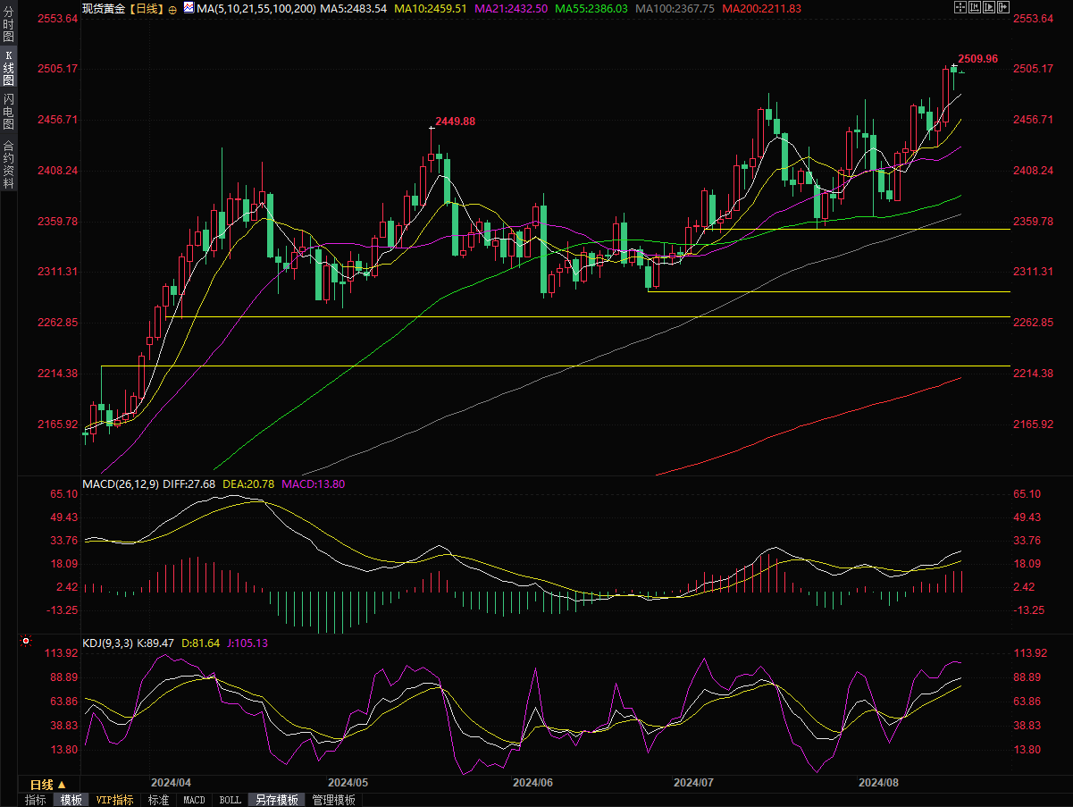 需要提醒的是,周一K线接近十字星,MACD也发出了顶背离信号,如果本交易日金价不能刷新高点,则会增加金价短线见顶和深度回调的可能性。下发留意5日均线2483.72附近支撑和10日均线2460附近支撑。