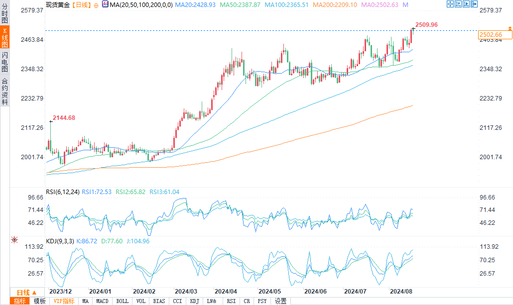 现货黄金报2502.09美元/盎司,跌幅0.19%。