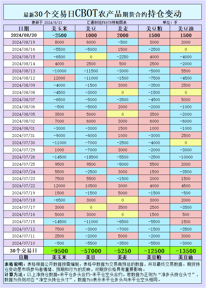 增加CBOT玉米投机性净空头;增加CBOT大豆投机性净空头;增加CBOT小麦投机性净空头;增加CBOT豆粕投机性净空头;增加CBOT豆油投机性净空头。