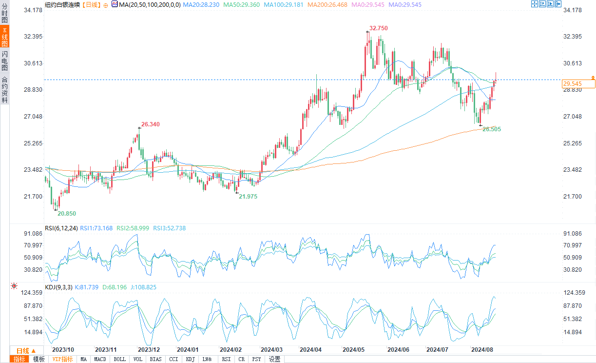 现货白银报29.475美元/盎司,涨幅0.18%。COMEX银报29.545美元/盎司,涨幅0.82%。
