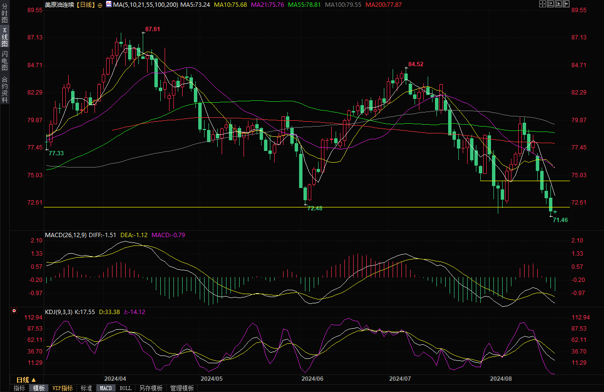 美原油目前交投于71.83美元/桶附近。油价周三每桶下跌1美元,为连续四个交易日下跌,刷新了逾半年低点,此前美国政府大幅下调投资者密切关注的一组就业统计数据,加剧了需求担忧情绪。